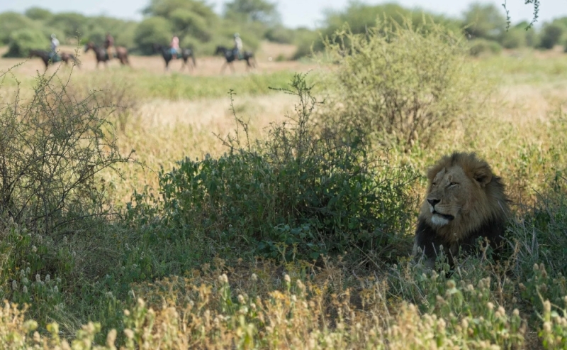Waking up at Tree Camp is a magical experience. You feel completely immersed in nature, surrounded by birdsong and experiencing the new day as the early morning light filters through the tree leaves. After a quick breakfast, the riders embark on the first long trek of the trip: climbing to the edge of the mini-escarpment, then descending through Elephant Valley and heading towards the distant sandstone citadels guarding the Limpopo and Motloutse Rivers. The first part of the journey should not be rushed, as the horses meander along well-defined elephant trails, past giant baobab trees and the occasional shallow watering hole. Soon, however, the countryside opens up and the horses can begin to stretch their legs on soft ground leading to the upper reaches of a stream that flows from the ridge down to the Limpopo. This is elephant country par excellence, and the guides are always on high alert, using all their keen senses. Once the trail leaves the river, the terrain opens up again, and the pace quickens. A second river is then reached, leading directly to the veterinary checkpoint on the main road through the Mashatu Game Reserve. The route then follows the road briefly before crossing flat country towards the intriguing Sacred Rock massif. Here, the mopane vegetation is short, and it's possible to cross the plain quite quickly and safely. Large herds of zebra, wildebeest, and impala inhabit this area. The guides mark their route using mashatu, leadwood, and apple trees as landmarks. Soon, the riders reach the old leadwood enclosure (once used as a traditional village court in Botswana) known as "Kgotla." This open-air enclosure provides the perfect and secure campsite for the night. The camp is not far from the banks of the Motloutse River, and with high concentrations of game living along the river's fertile floodplain, the area is home to large prides of lions and clans of hyenas. The sounds of these predators at night provide unforgettable memories! In the afternoon, we search for the area's resident lion on a game drive and conclude the day's adventures with an aperitif on the ancient rocks of "The Amphitheater." While sightings of big cats on horseback do occasionally occur, Horizon Horseback maintains a policy of keeping them at a distance. The best opportunities to approach lions, cheetahs, leopards, and spotted hyenas arise on game drives where the vehicle acts as a natural hide and is largely ignored by predators.