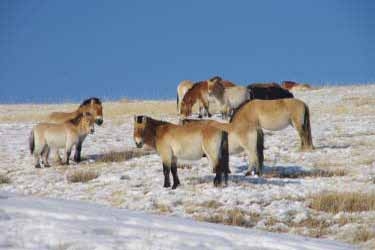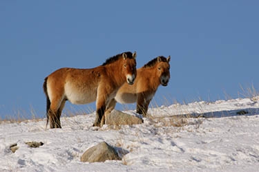 Breakfast, then drive to Khustai National Park. We cross spectacular landscapes of rolling steppe, with forested peaks and immense valleys... This is our first encounter with the icy expanses of Mongolia in winter: dusted with a thin layer of snow, the steppe seems even more immense. Only a few golden grasses protrude from the ice, catching the sun's rays under an invariably blue sky. We leave the main road to take a dirt and ice track for about fifteen kilometers before reaching Khustai National Park. Lunch at the yurt camp. In the afternoon, we set off by vehicle into the park in search of the famous Przewalski's wild horses. The Khustai yurt camp has fairly modern bathrooms compared to the rest of the country, and even in the depths of winter, you can normally take a hot shower—you should take advantage of it!