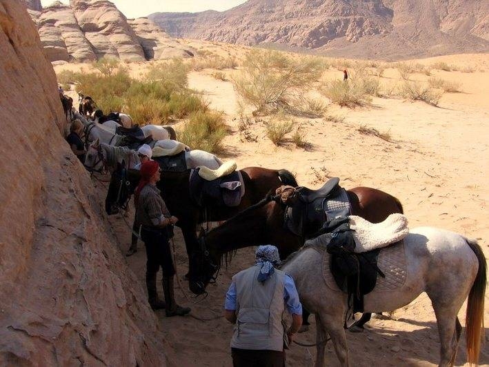 The Wadi Rum mirrors a moonscape of ancient valleys and towering, weathered sandstone mountains rising out of the white and pink colored sands. A scene right out of the exploits of Lawrence of Arabia and the authentic setting of the film, the Wadi Rum presents many opportunities for long canters across high plateaus. Traveling along old caravan roads offers an encounter with an altogether different world, complete with possible personal invites from the desert dwelling Bedouins. Live the life of the Bedouins all the way down to the Saudi Arabian border and the Disi mountains and discover the spectacular rock formations, Jordan's answer to the Grand Canyon and undoubtedly the largest and most magnificent of Jordan's desert landscapes - a horseback riding holiday you will not forget.